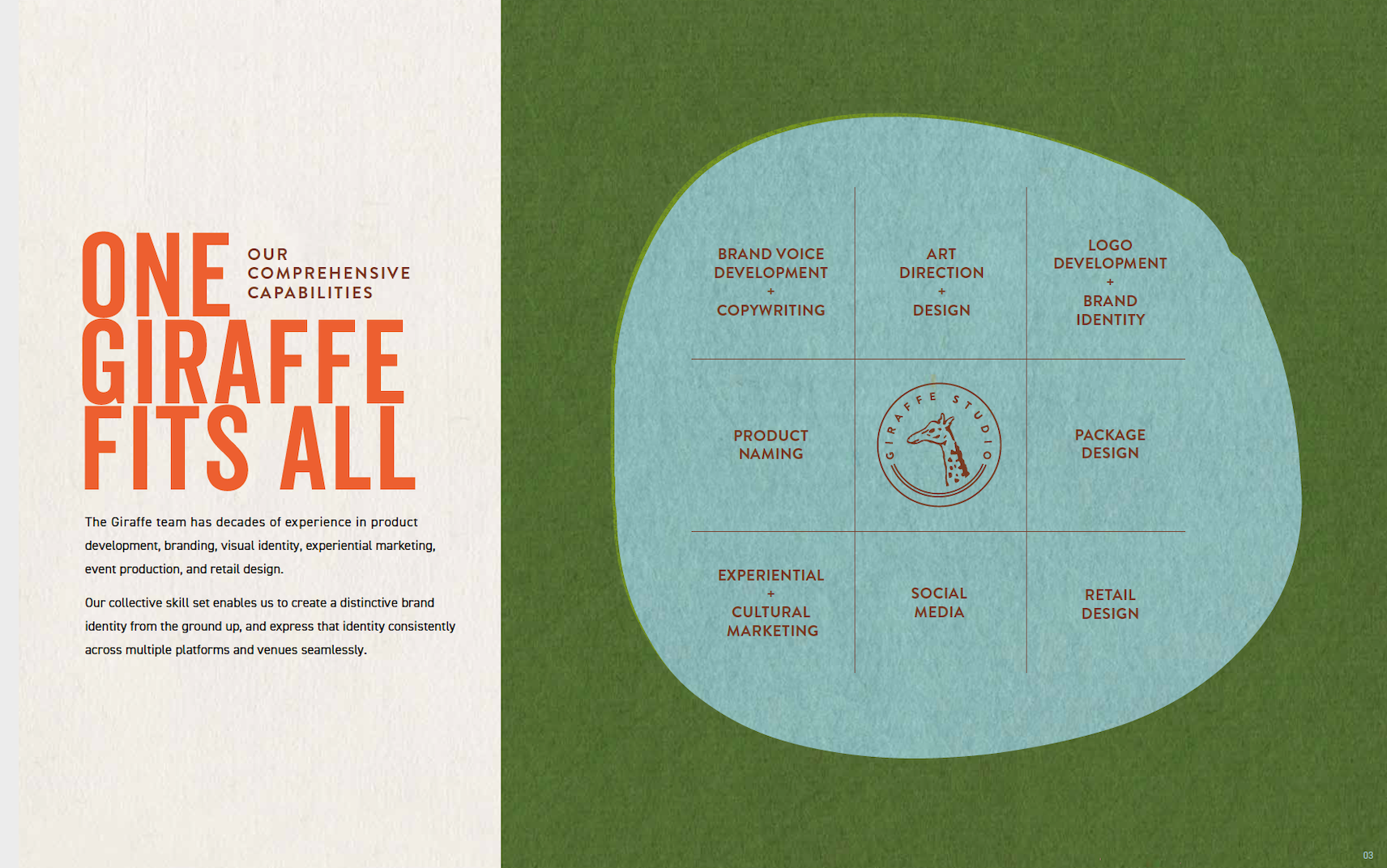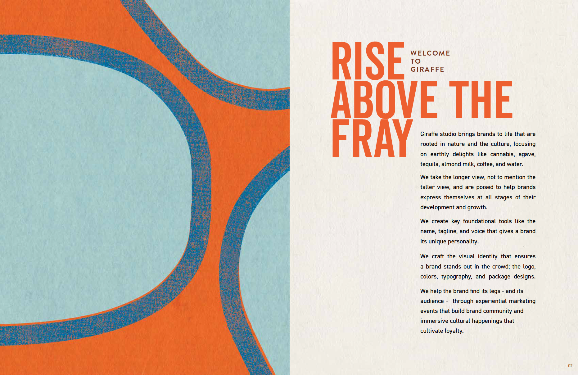 Giraffe is a creative studio that brings brands to life that are rooted in nature and the culture, earthly delights like cannabis, coffee, and tequila. Mark is one of the founding partners along with experiential designer Kim Swift. Working with designer An Diels they created a guide that explained and differentiated the Giraffe approach to branding. Capabilities and process were elements of the agency’s pitch deck.